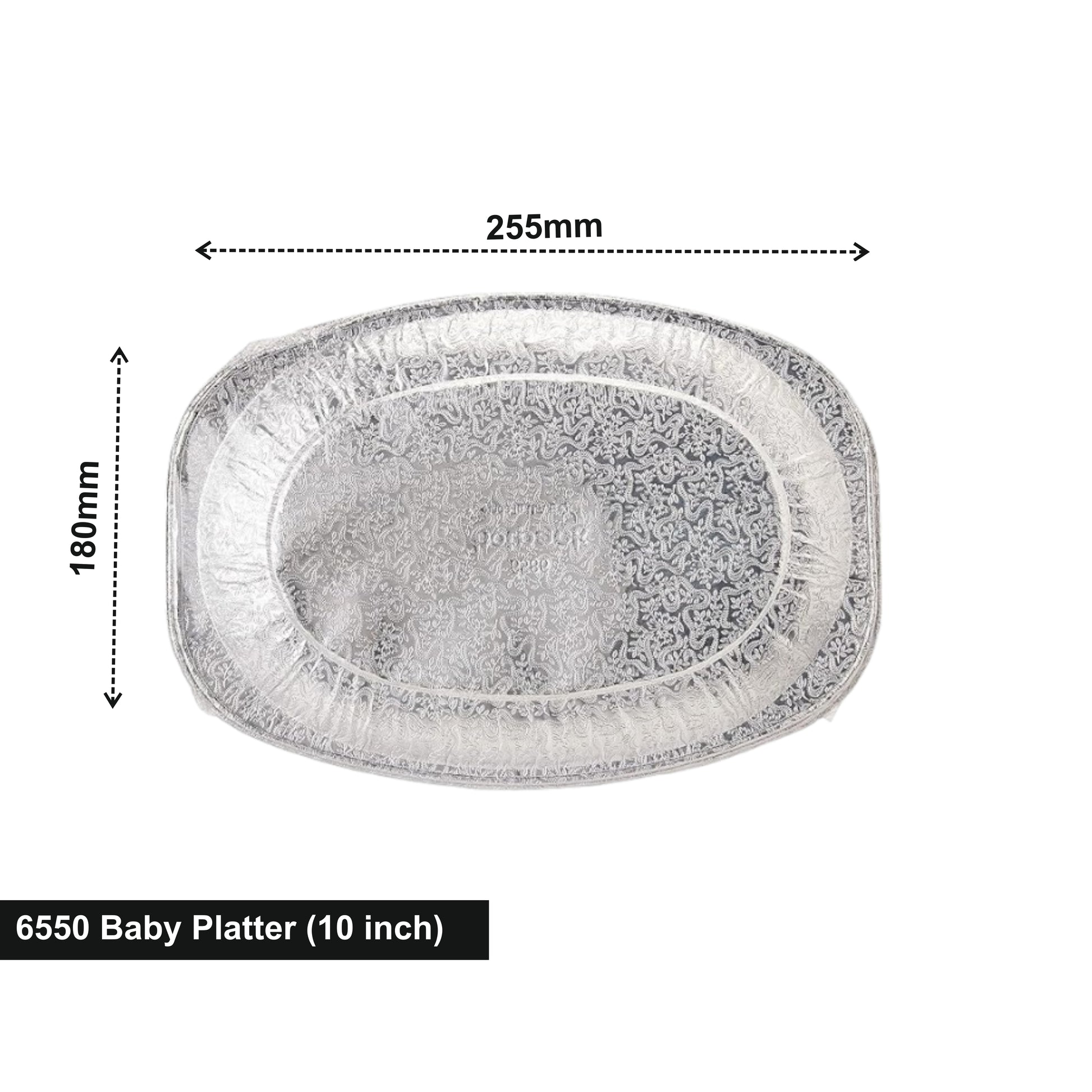 The 6550 Baby Platter (10 inch) is a lightweight, stylish aluminium serving platter ideal for presenting snacks, starters, sweets, bakery items, and small meal portions. Designed with an elegant embossed pattern, it enhances food presentation while remaining disposable, hygienic, and convenient for events and catering.