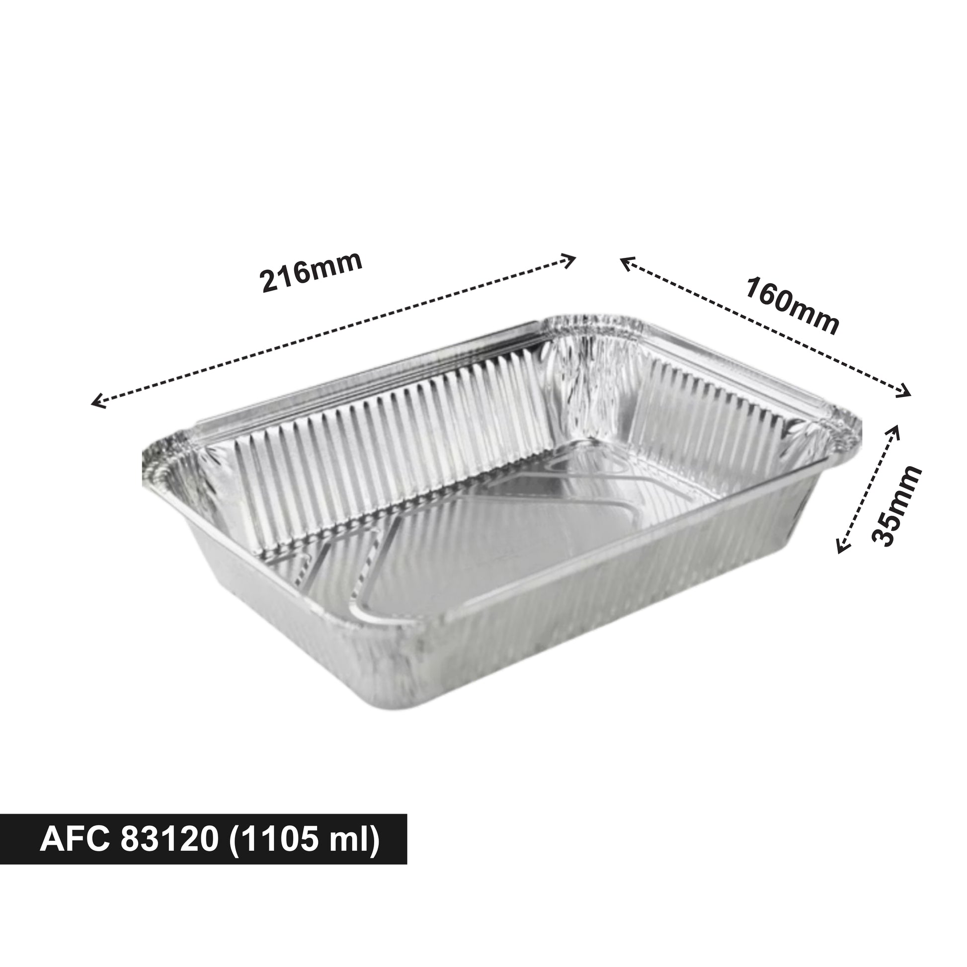 The AFC 83120 (1105 ml) Foil Container is a durable, medium–large aluminium tray ideal for packing hearty meals, biryanis, noodles, pasta, gravies, and oven-baked dishes. Its sturdy design ensures excellent heat retention and safe transport, making it perfect for food delivery and catering.