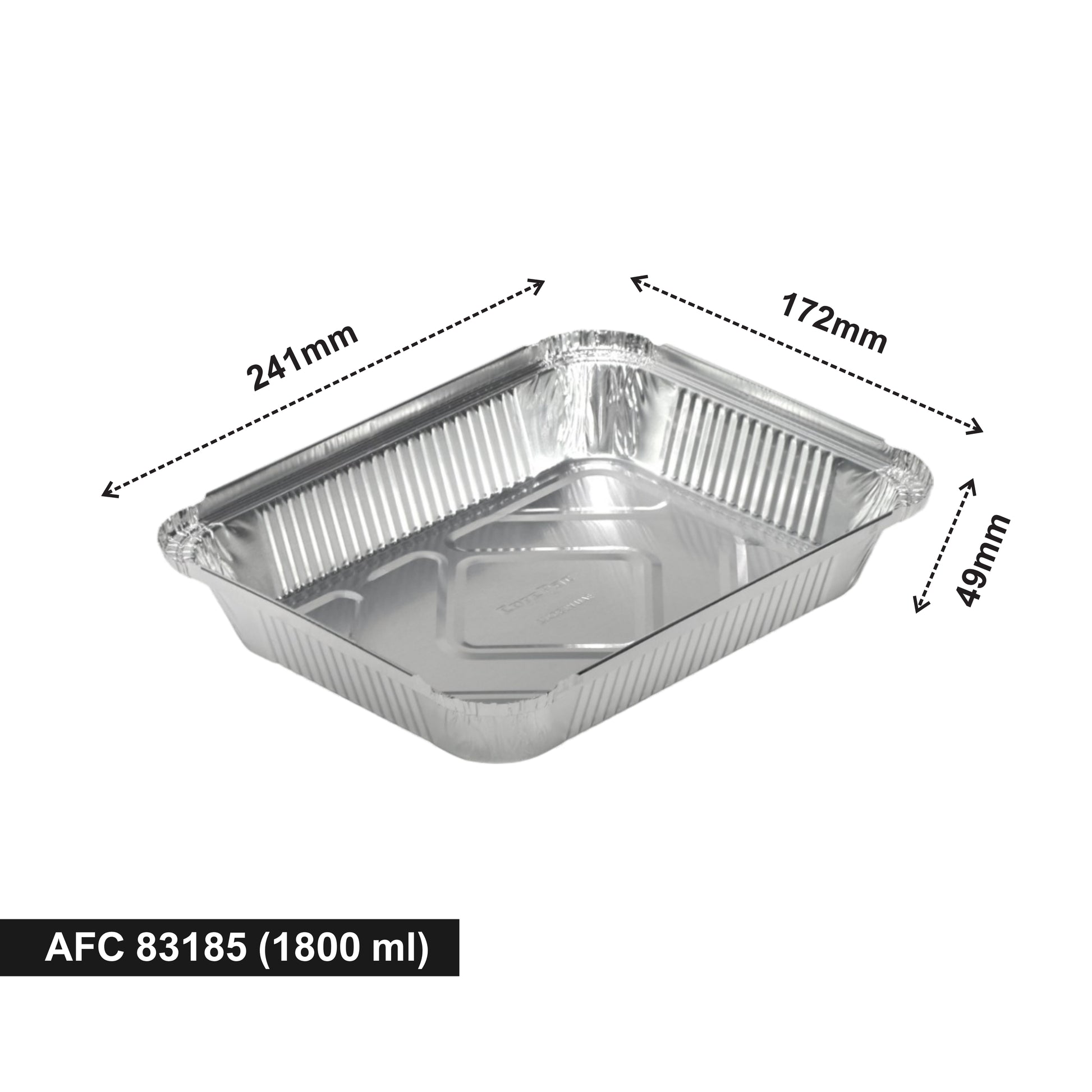 The AFC 83185 (1800 ml) Foil Container is a heavy-duty, large-capacity aluminium tray ideal for packing family-sized meals, biryanis, pasta, gravies, roasted dishes, and oven-baked items. Its strong build ensures excellent heat retention and secure transport, making it perfect for catering and delivery.
