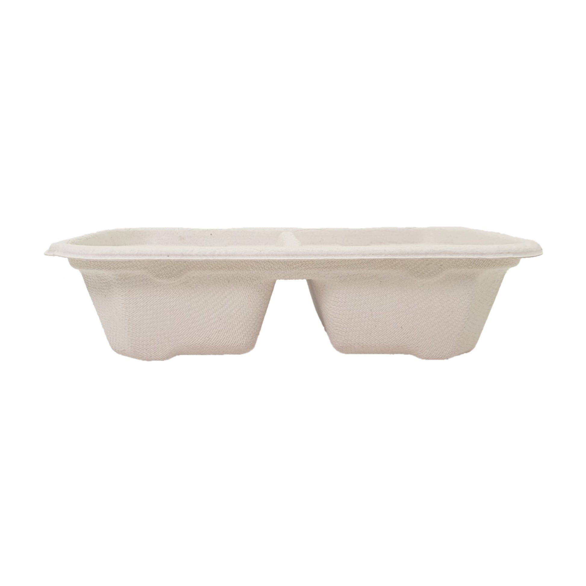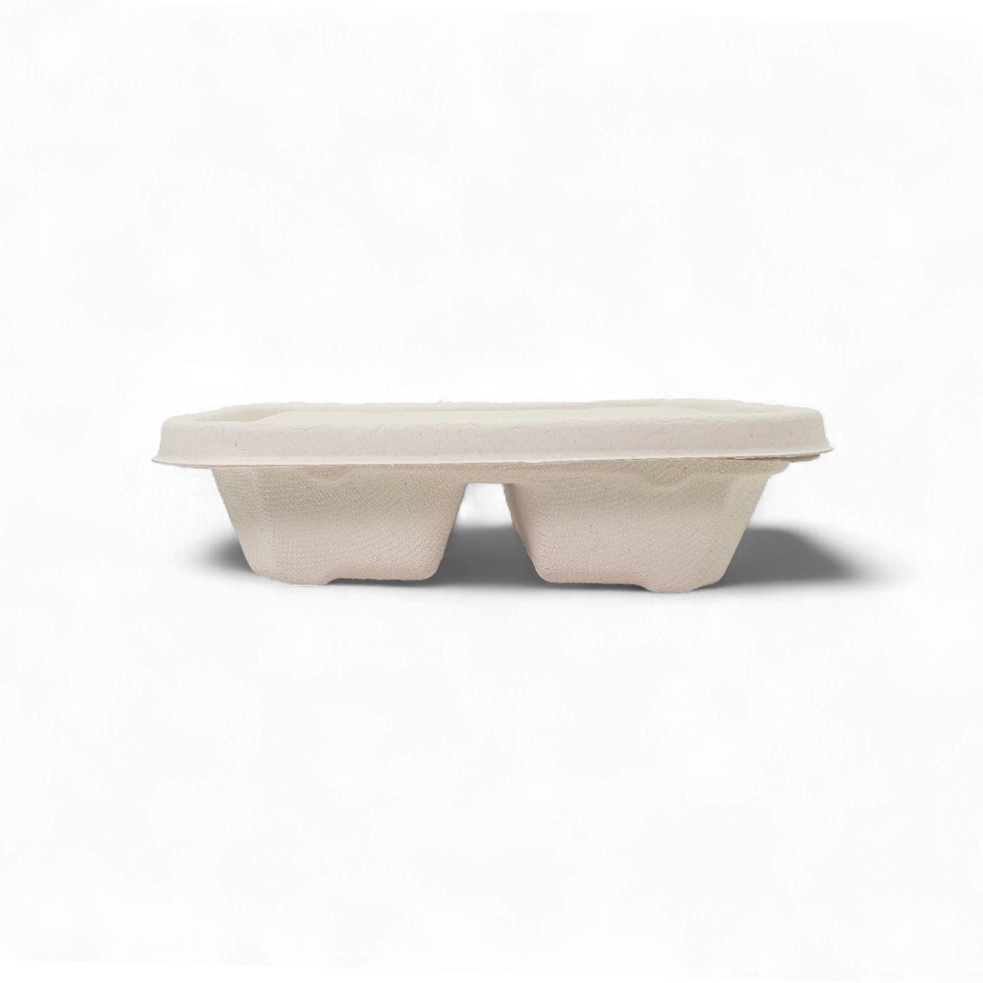 2-compartment 550ml bagasse container, perfect for meal combos. Strong, compostable, and microwave safe. Secure lid for 2CP 550ml container. Provides spill resistance and keeps meals fresh during delivery.