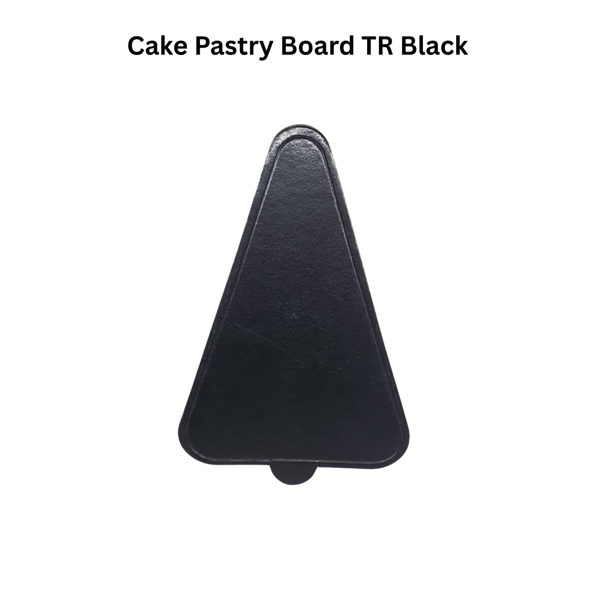 Triangle black pastry board developed for slice cakes and wedge-style desserts. Ensures stable support, neat plating, and professional presentation for bakery counters and dessert takeaway. Helps maintain shape while transferring and boxing.