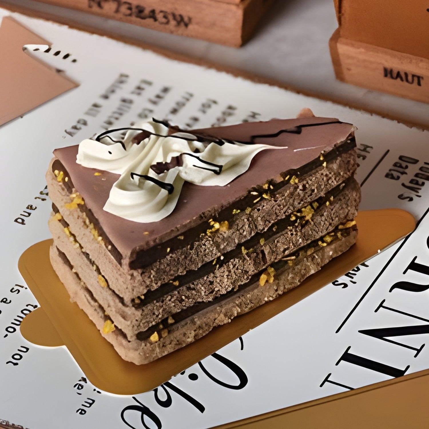 Triangle gold pastry board created for wedge desserts and cake slices with a premium gifting look. Provides stable support for clean plating and safe takeaway, especially for festive and celebration orders.