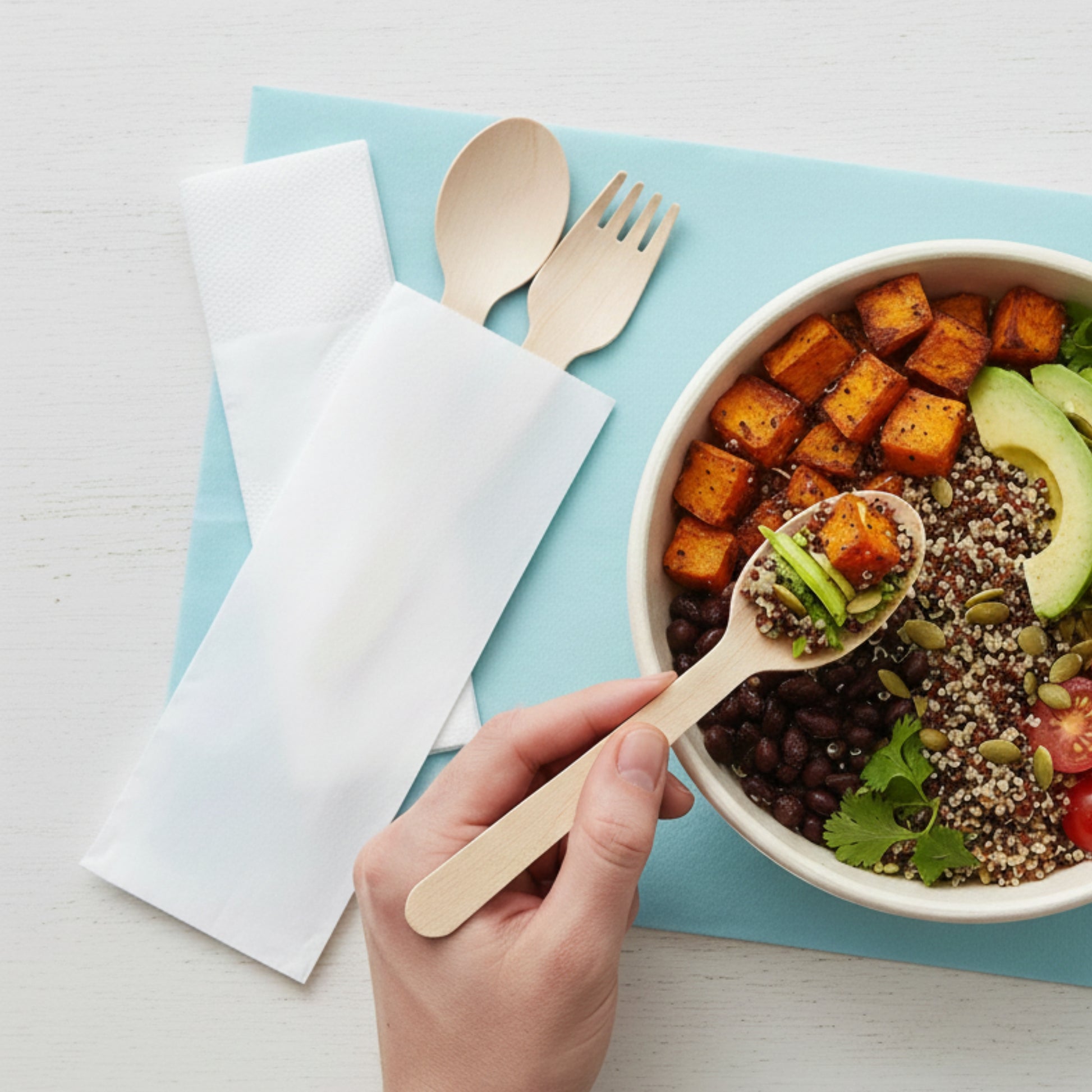 Eco-friendly wooden cutlery set designed for hygienic and convenient food service. Manufactured using food-grade natural wood, these cutlery sets are ideal for takeaway meals, QSRs, and catering. They provide a sustainable alternative to plastic while maintaining strength and usability. Suitable for restaurants, cloud kitchens, food trucks, and events.