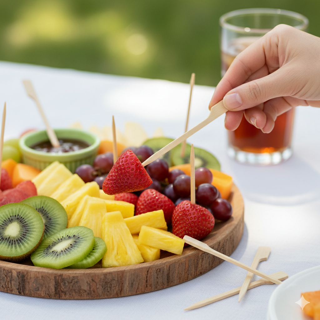 | Usage | The 4 inch gun or paddle stick is a flat bamboo skewer designed for appetizers, fruit cubes and bite‑sized snacks. Its paddle handle gives better grip and control, making it convenient for party platters, catering and buffet setups. |