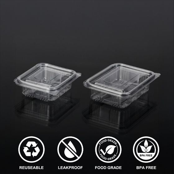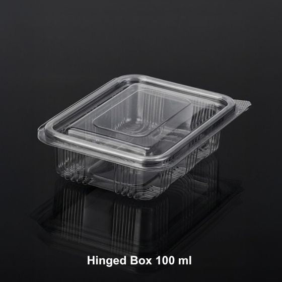 A compact 100 ml hinged box crafted for secure, hygienic, and clear packaging of small food portions, ideal for dips, salads, toppings, and snacks.