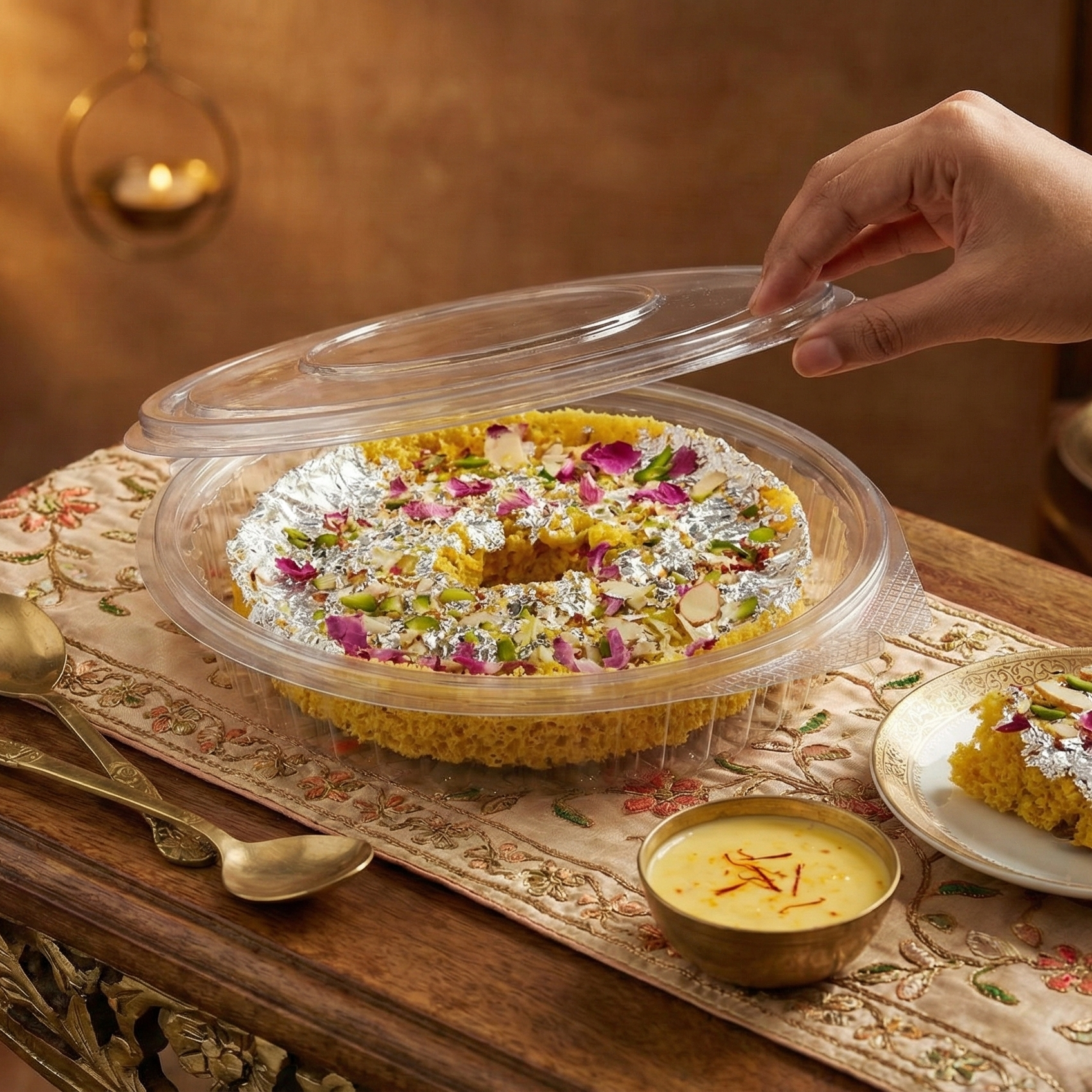 | Usage | Ideal for sweet shops, gift packs, festive hampers, cloud kitchens, and retail packaging of ghevar, specialty desserts, and large traditional sweets. |