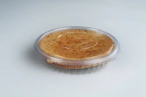 A large round 34 oz flat hinged box specially designed for secure, hygienic, and moisture-safe packaging of khakhra, roasted snacks, and crunchy dry items.
