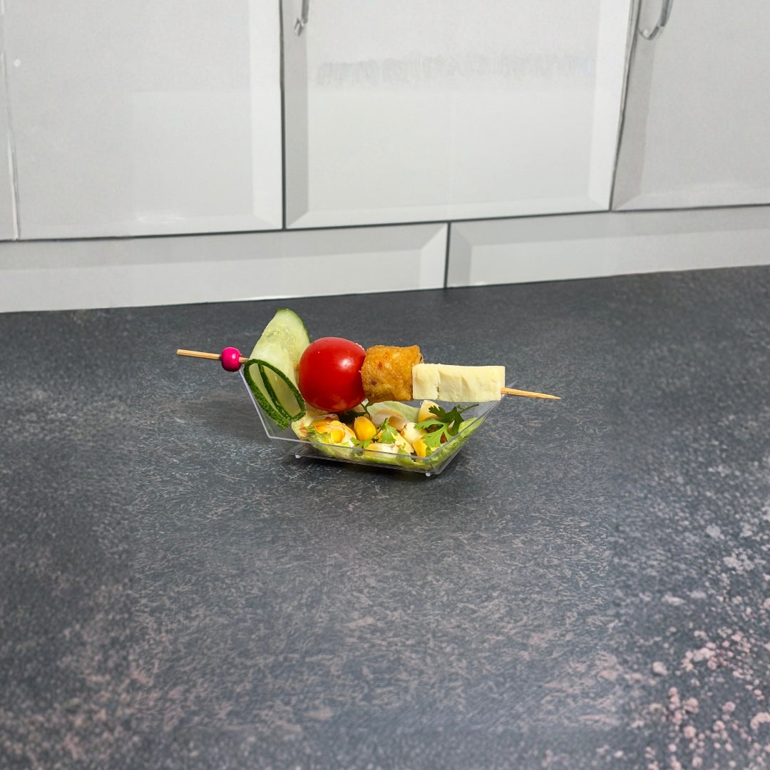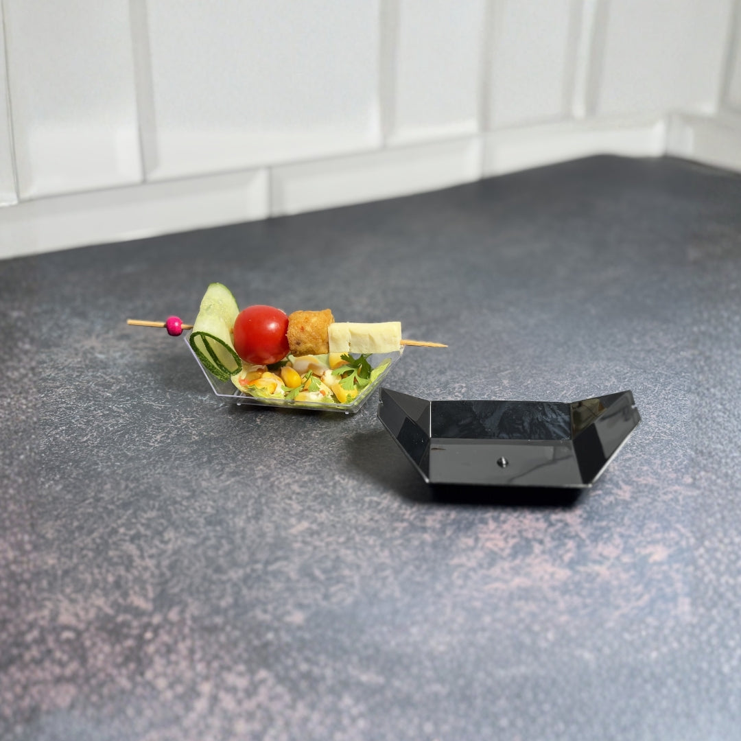 NP PS 9 is a 4-inch boat tray used for snacks, fries, starters, and dessert sides. Available in black and clear options, it is suitable for cafés, QSRs, events, and takeaway counters.