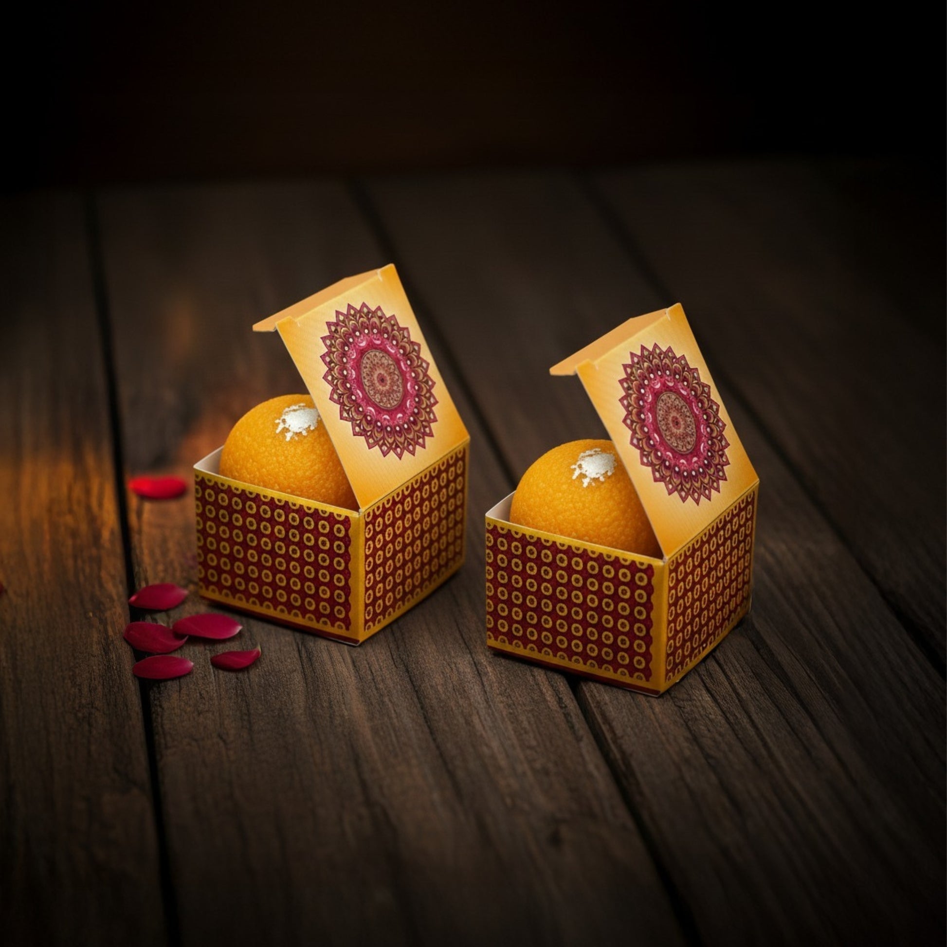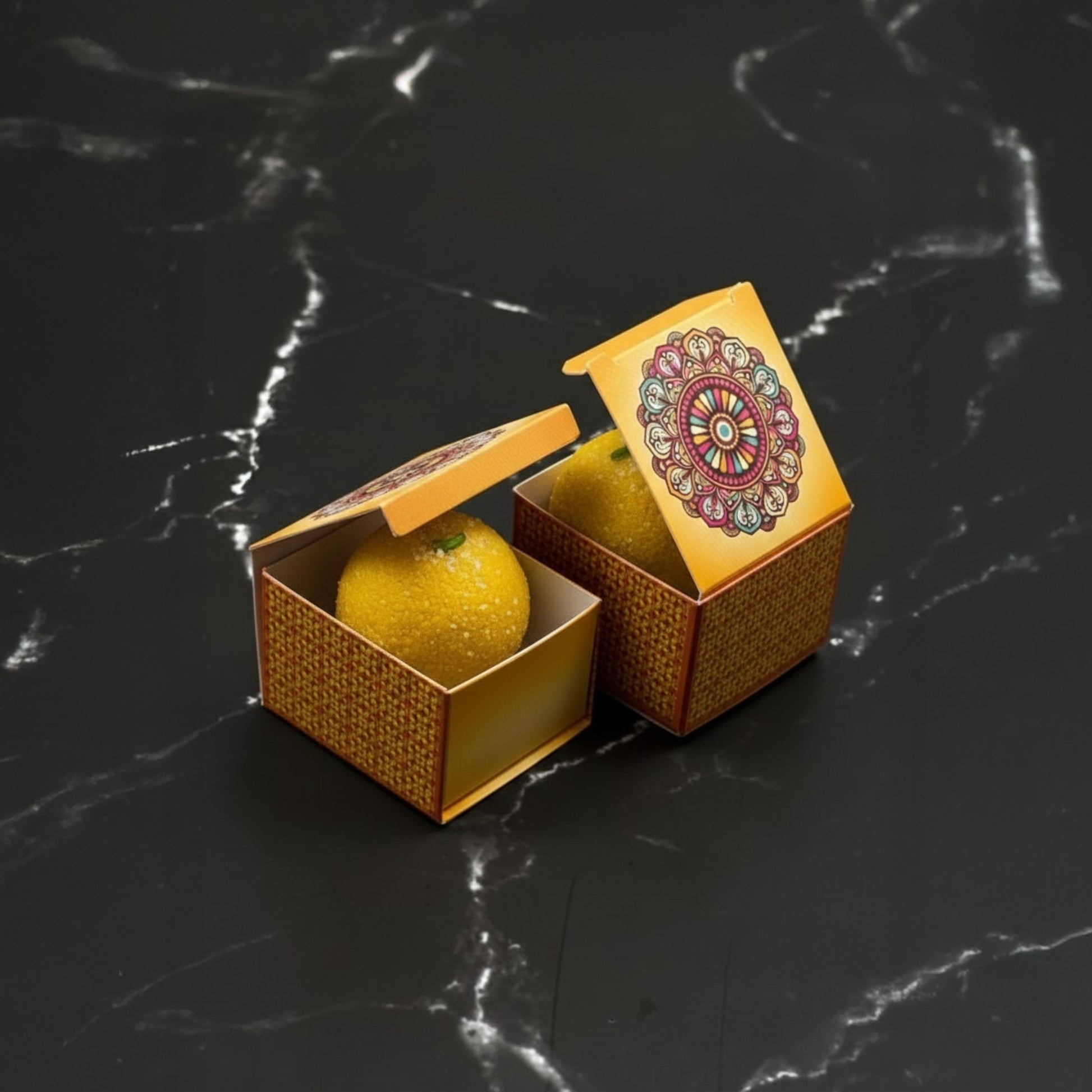 Compact peda box designed for hygienic packing and premium presentation of Indian sweets. Ideal for single Peda or Laddu, ensuring product freshness and clean handling during takeaway and delivery.
